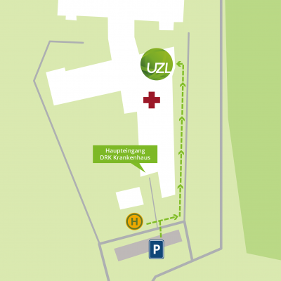 Wenn Sie vor dem Haupteingang des DRK-Krankenhauses stehen, gehen Sie bitte noch ca. 20 m nach rechts. Ab da folgen dann zu Fuß dem Weg für den Rettungsdienst. Sie laufen dabei am Anbau der Intensivstation und am alten Haupteingang vorbei. Nach etwa 100 m befindet sich der Seiteneingang des UZL unter der Durchfahrt auf der linken Seite. Bitte beachten Sie auch die Beschilderung vor Ort.